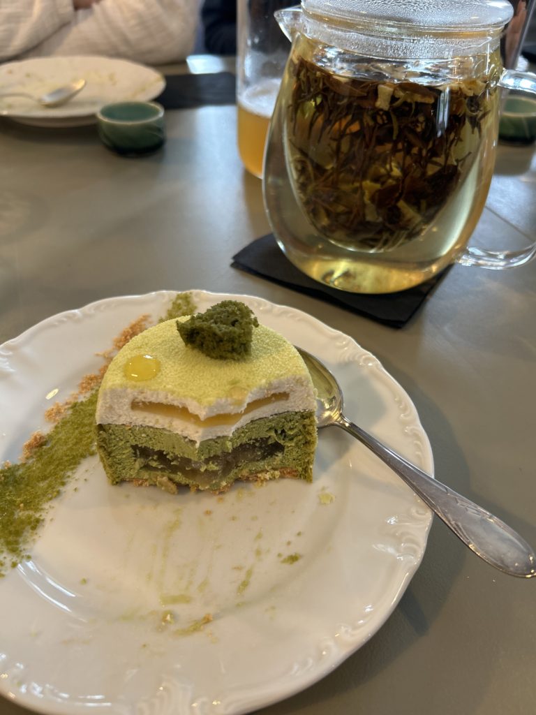 Après un déjeuner à la plantisserie, nous avons été rejoints par une petit groupe pour parler thé l’après-midi au jardin puis autour d’un tea-time. Manu nous avait préparé un petit entremet au nashis, thé matcha et sudachi du jardin…